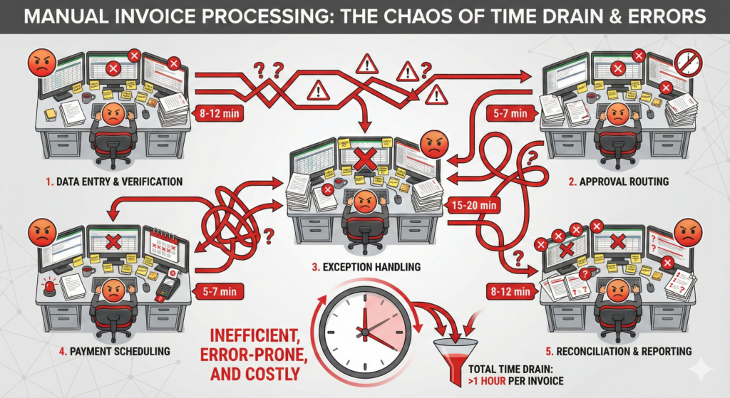 Total time per invoice: 45-60 minutes of human attention.