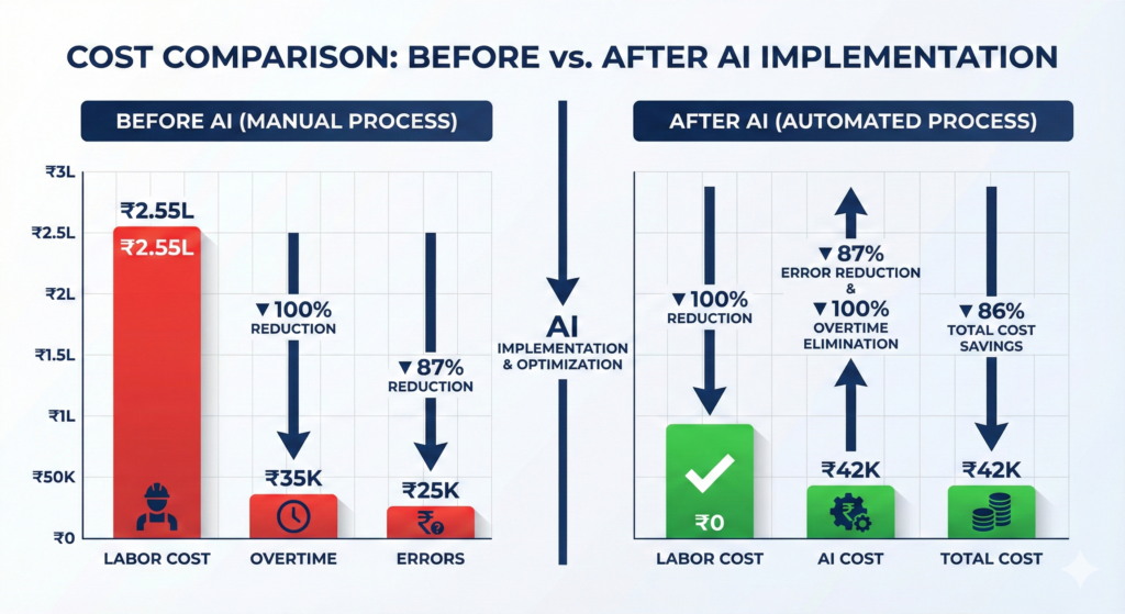 Total monthly infrastructure: ₹27,000 Total monthly human oversight: ₹28,000 Combined: ₹55,000 (Note: Actual production cost ₹42,000 due to reserved instance discounts and optimization)