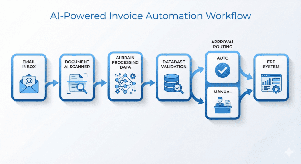 - Validation: Automated cross-check against purchase order database, vendor master file, and historical patterns