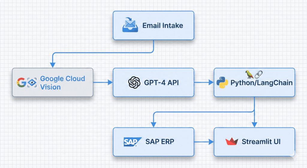 - Extraction: OCR captures all text, AI model (GPT-4) extracts structured data (vendor name, invoice number, date, line items, amounts, tax calculations)