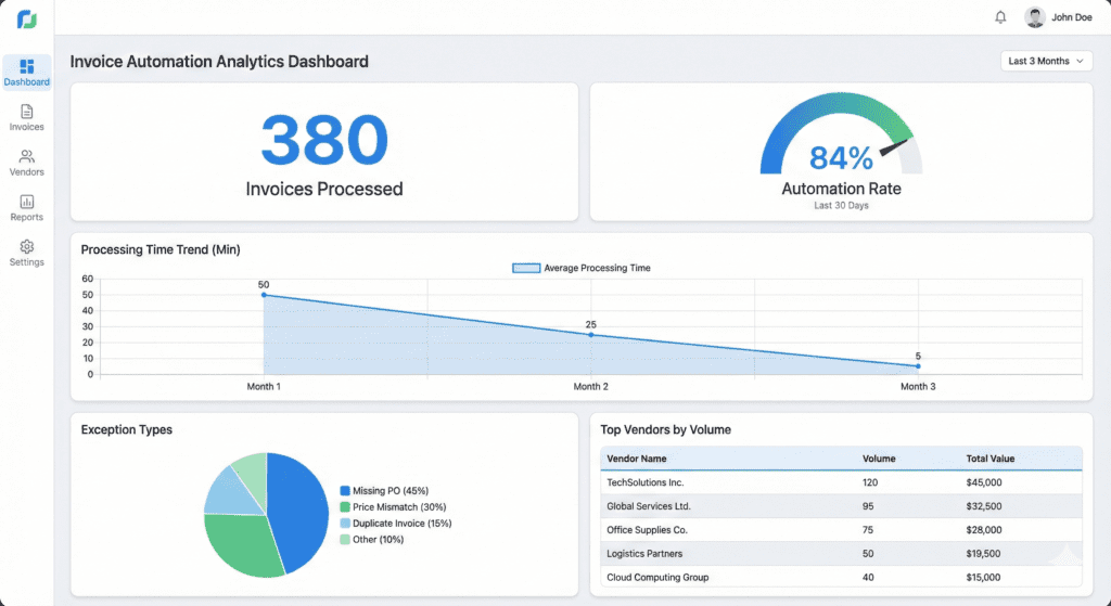 - After: 2-3% (mostly edge cases with poorly formatted vendor invoices)