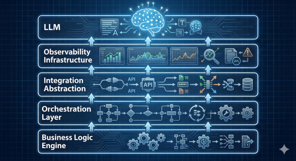 The LLM is the decision-making component, not the entire system. It operates within guardrails defined by the other four layers.